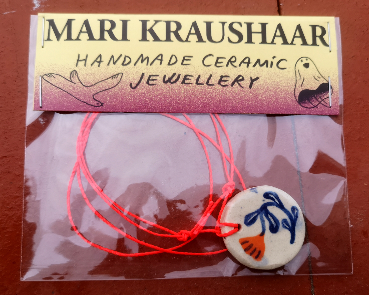 Handmade and painted pendant made from high temperature clay, with an adjustable chain made of waxed string.