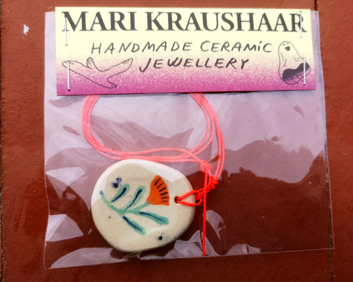 Handmade and painted pendant made from high temperature clay, with an adjustable chain made of waxed string.